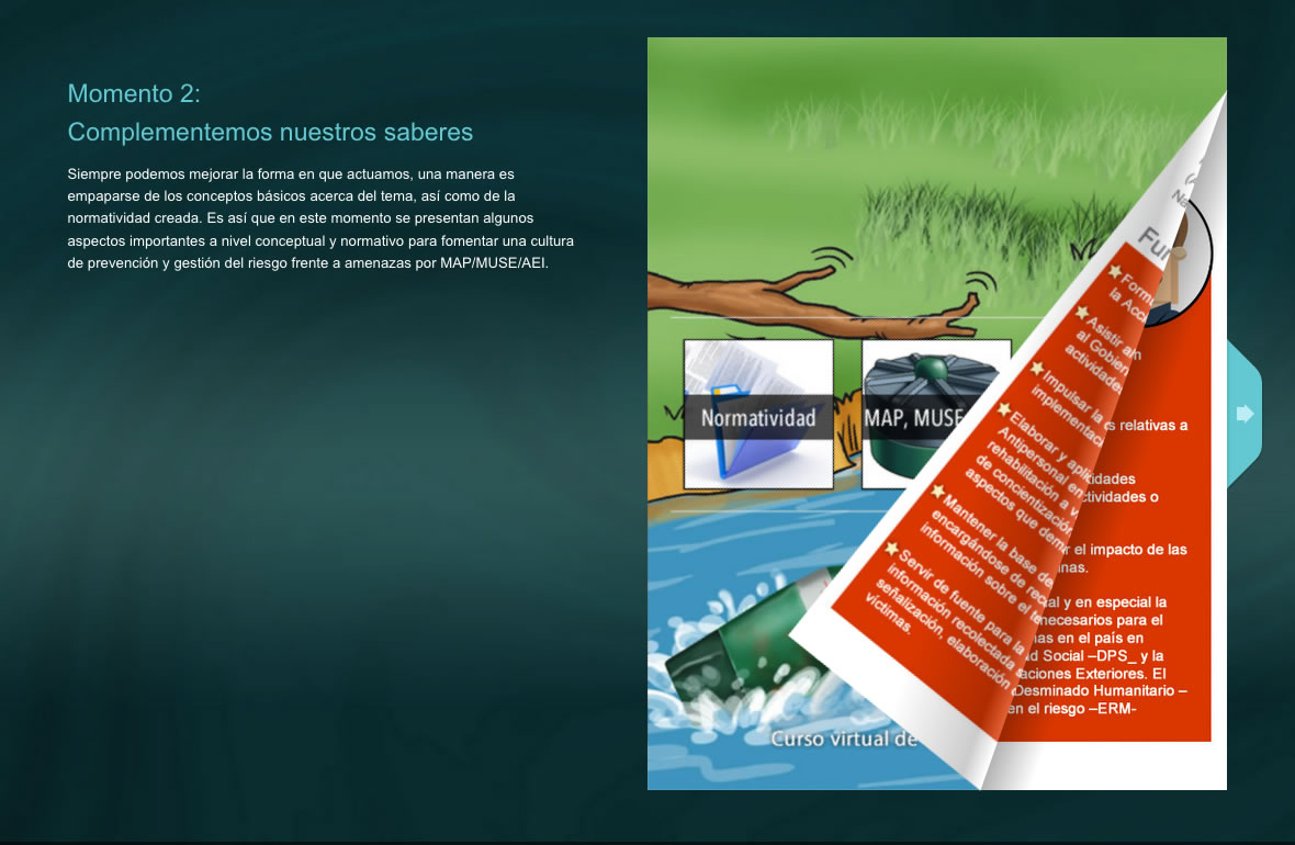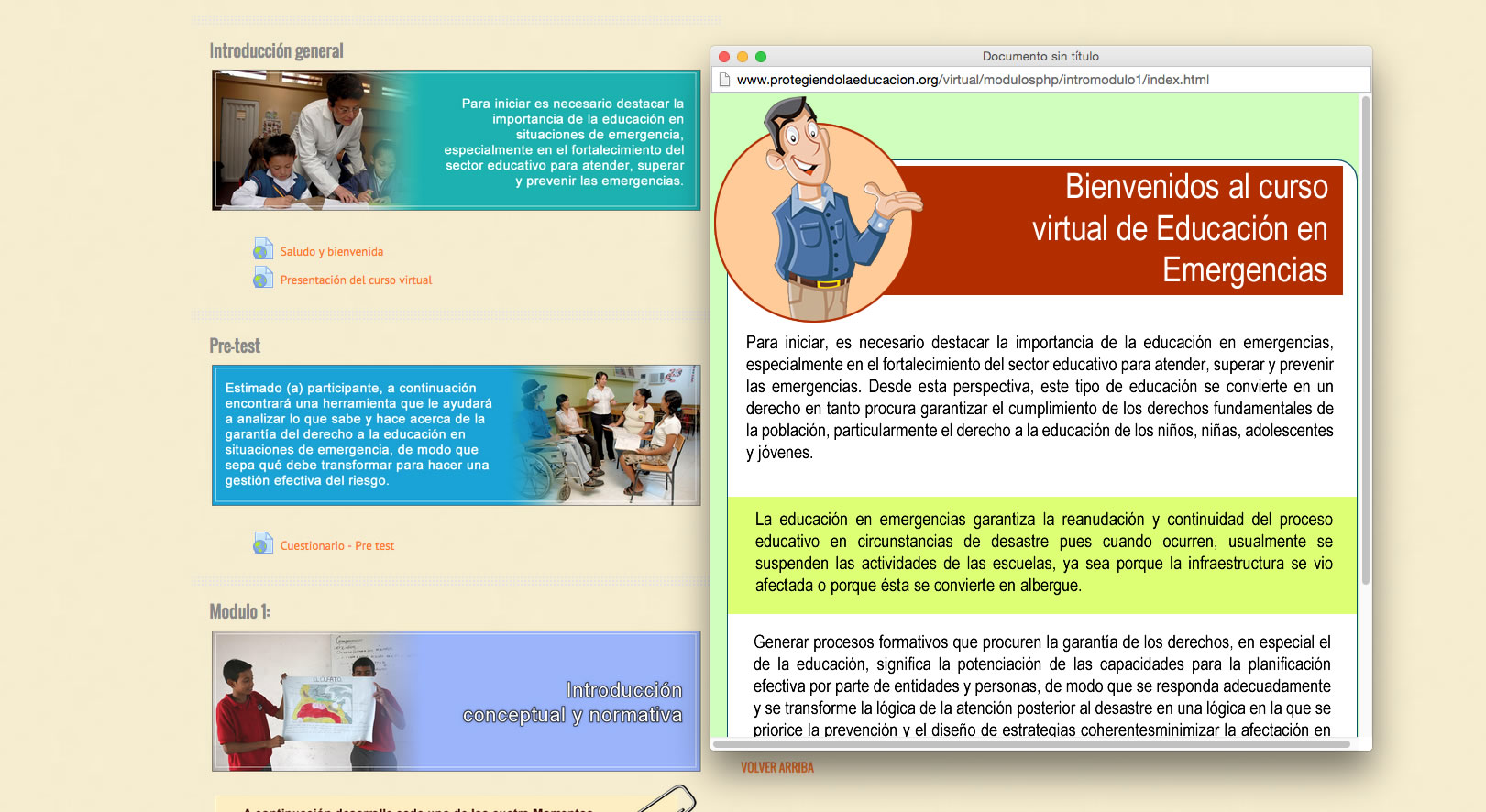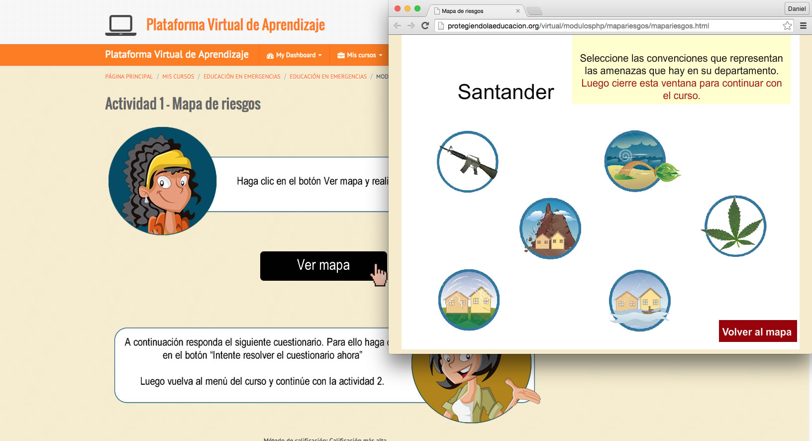 El primer curso que se implementó fue el Curso de Eduación en Emergencias, para el cual se desarrollaron diferentes actividades. Lo primero que se tuvo en cuenta fue mantener una identidad visual durante todo el curso. Se crearon tres personajes diferentes que guían al estudiante en los diferentes momentos del curso: lección, evaluación, retroalimentación.